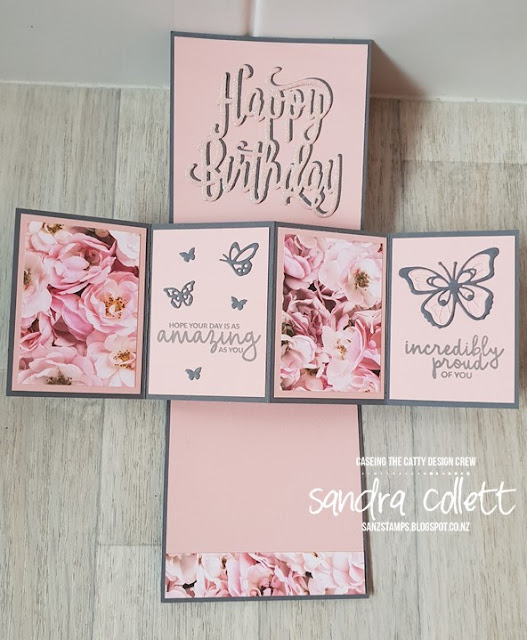 Each panel has a layer of Blushing Bride card added, then two have the Petal Promenade DSP and the other two have greetings from the Incredible Like You stamp set. The butterfly was removed from the bottom of the front image to make room for the numbers and it features on the inside. There are heaps of tiny butterfly dies in this set, so it makes it easy to cut a few at once. I've added a strip of that same lovely DSP along the bottom to finish.
